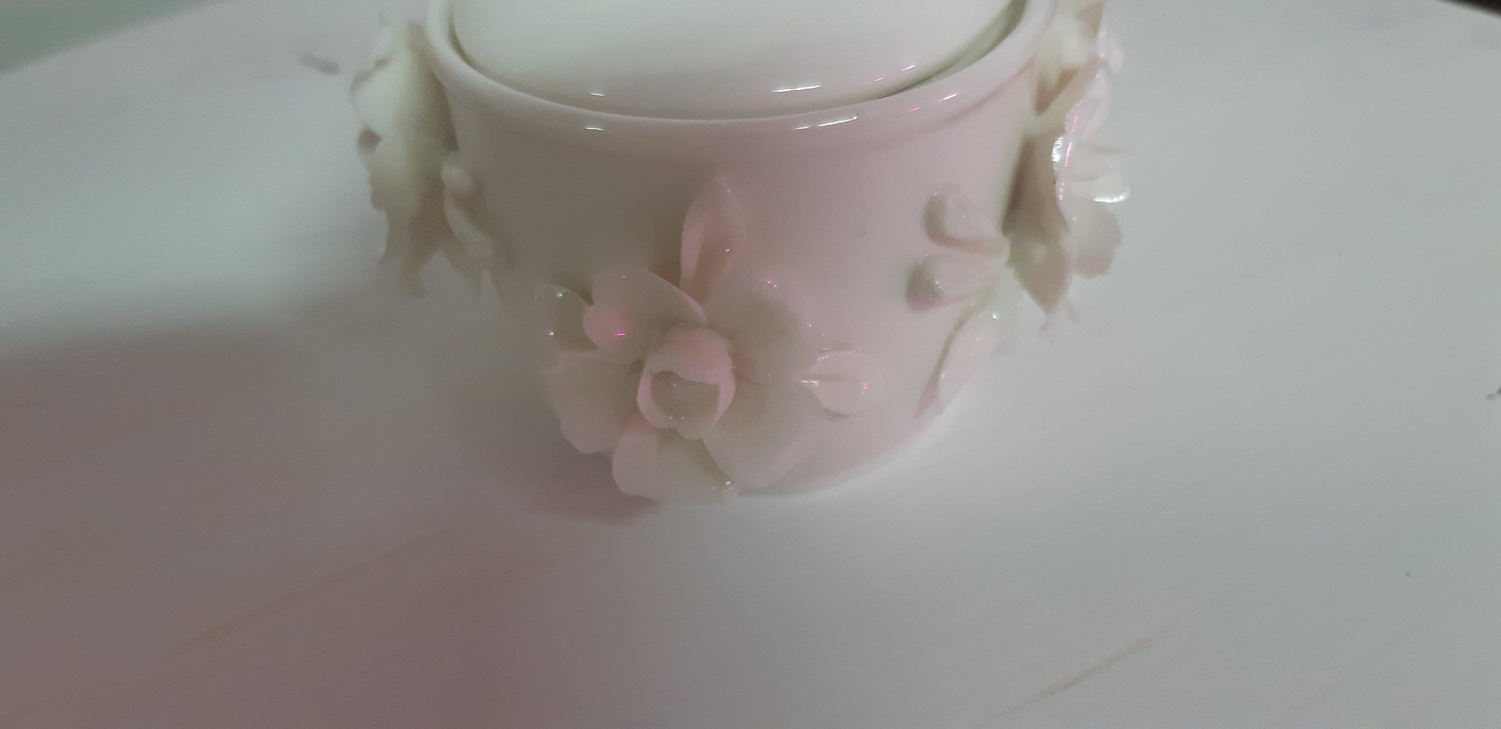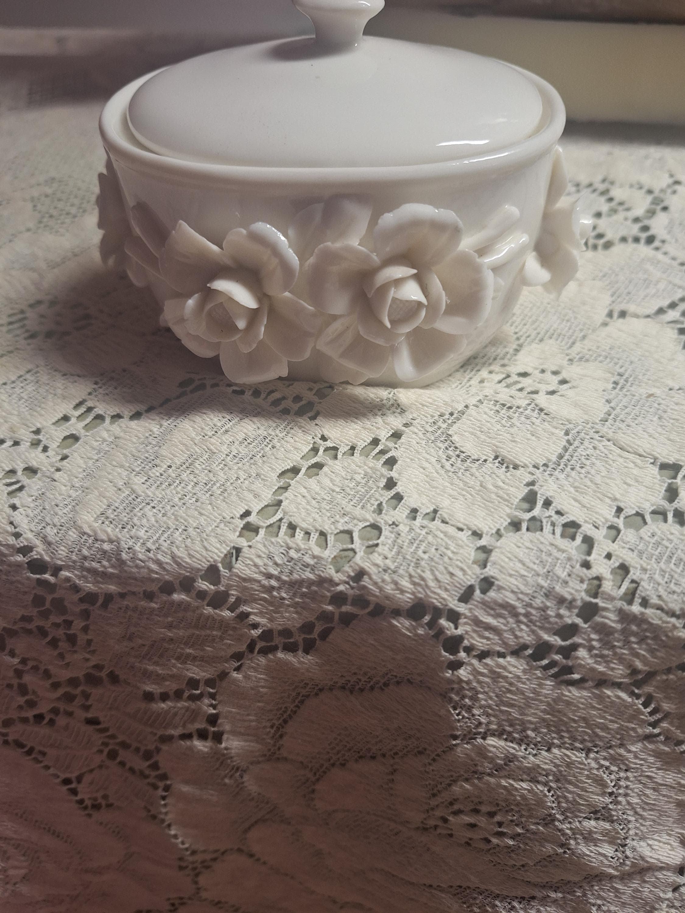 this dish is from my Vintage store. It is a pretty white ceramic dish with sculpted flowers around the sides. It measures 4 inches long and 3 inches wide. Its depth is 2 inches. The dish holds a hand poured soy candle scented with lavender. Also comes with a lid. Would be an awesome gift for Mothers day, sister in law, sister, daughter, mother in law. comes with a silver gift bag